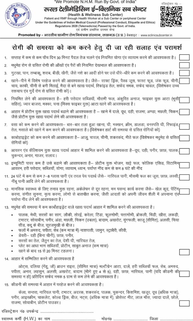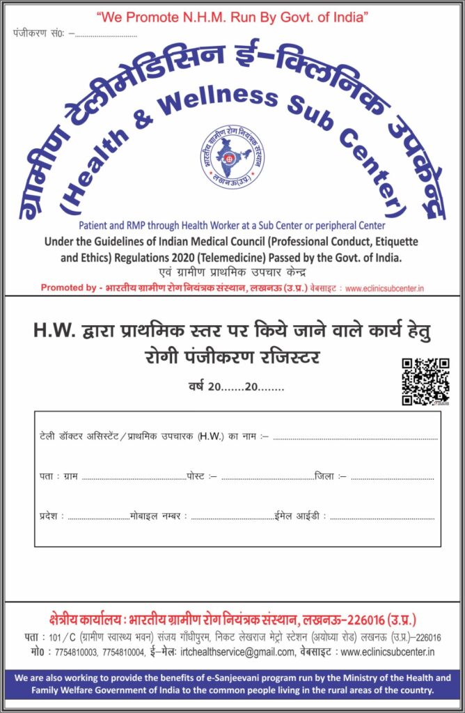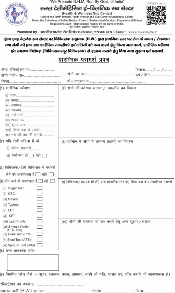 ई-क्लिनिक उपकेन्द्र पर उपयोग किये जाने वाले रोगी पंजीकरण रजिस्टर, सहमति पत्र, रोगी स्वास्थ्य परीक्षण/रेफरल प्रपत्र का प्रारुप