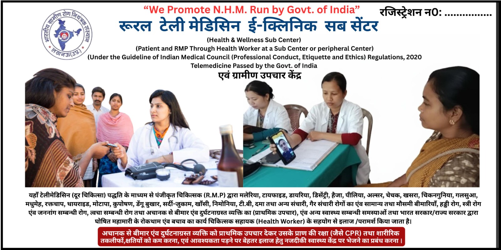 भारत सरकार द्वारा देश के ग्रामीण/दुर्गम क्षेत्रों में निवास कर रहे आम लोगो को इलाज कराने हेतु पंजीकृत चिकित्सा व्यवसायी (R.M.P) एंव उपलब्ध संसाधन आबादी/जरुरतमंद के हिसाब से कम होने के कारण होने वाली कठिनाइयों, संचारी रोग एंव गैर संचारी रोगों का प्राथमिक स्तर पर नियंत्रण एंव शहरी चिकित्सालयों में बढ़ती भीड़ से उत्पन्न समस्याओं को कम करने एंव पंजीकृत चिकित्सा व्यवसायी (R.M.P) को सम्पूर्ण भारत में टेलीमेडिसिन (दूर चिकित्सा) के माध्यम से इलाज करने हेतु Indian Medical Council Act 1956 अधिनियम का इस्तेमाल करते हुए 25 मार्च 2020 को भारत का राजपत्र (The Gazette of India) CG-DL-E-14052020-219374 में जारी किया गया, तथा ऱाष्ट्रीय आर्युविज्ञान आयोग (National Medical Commission) N.M.C द्वारा 23 मई 2022 को एंव 02 अगस्त 2023 को जारी भारत का राजपत्र (The Gazette of India) CG-DL-E-09082023-247951 में राष्ट्रीय आयुर्विज्ञान आयोग पंजीकृत मेडिकल प्रैक्टिसनर विनियम 2023 में (i) Patient and RMP (ii) Care Giver and RMP (iii) Patient and RMP through Health Worker at a sub center or peripheral Center (iv) RMP and another RMP/ Specialist (v) Telemedicine Triage and Covid Care for Patients इस रुपरेखा (Framework) के अनुसार आडियों काल, विडियों काल एंव टैक्स्ट मैसेज के माध्यम से इलाज करने हेतु Public Notice जारी किया गया।